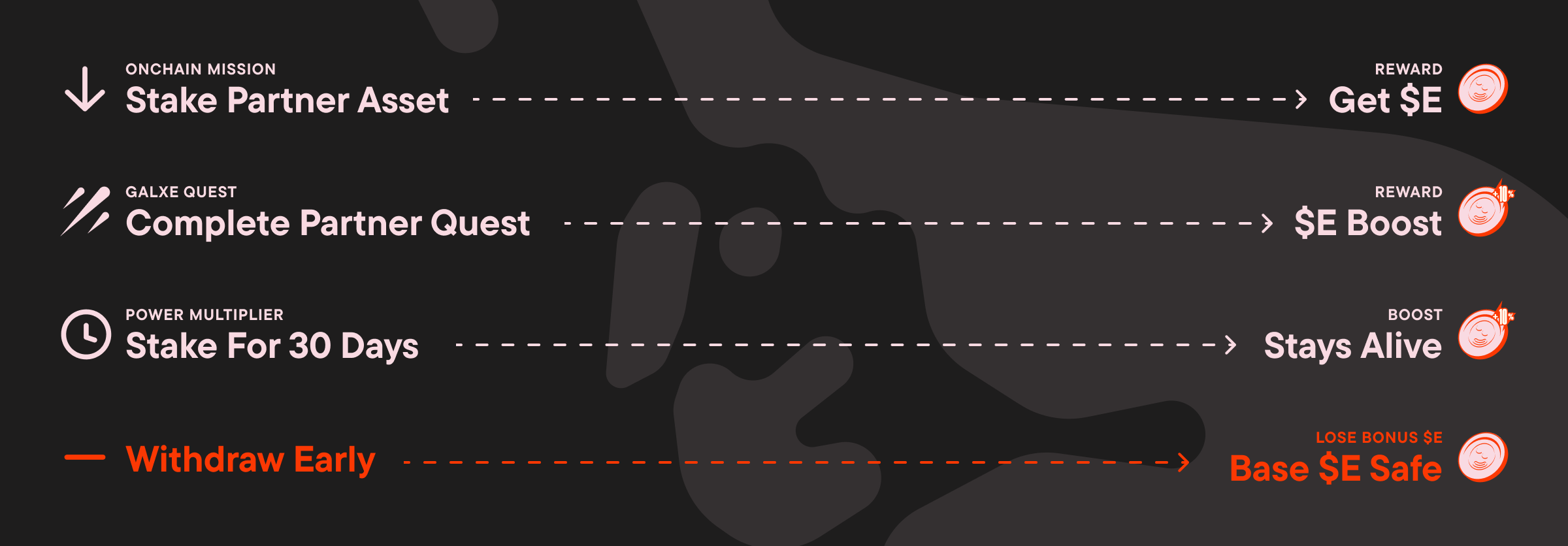 By staking assets in partner vaults, completing missions, and holding your ground, you’ll earn $E rewards, starting with a base rate and growing through boosts of 10–50% for completing each partner’s quest.