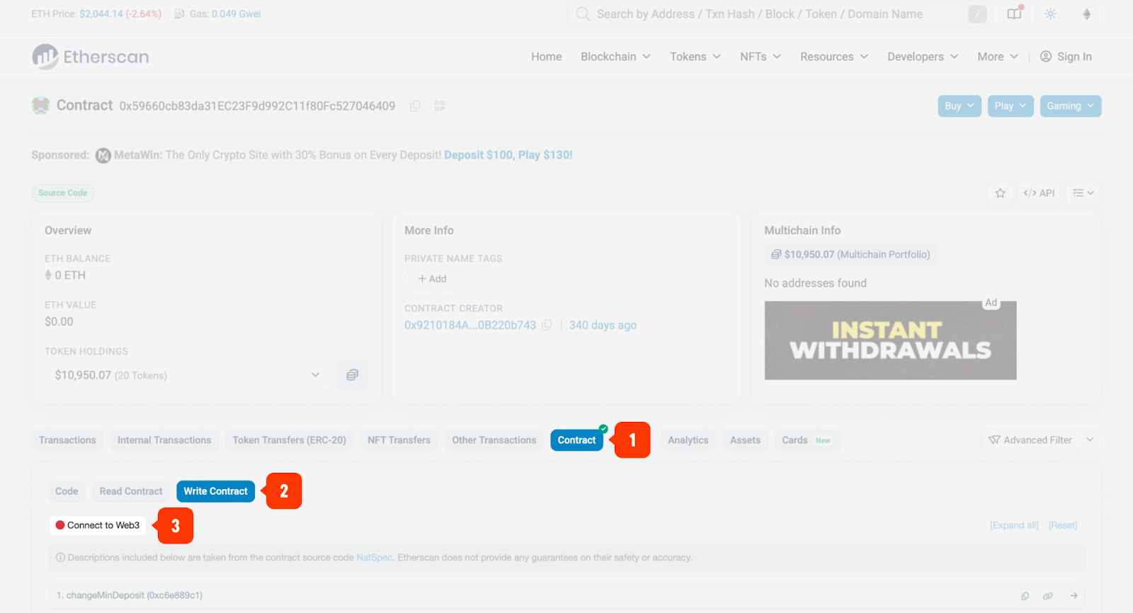 1. Open the block explorer for the corresponding network and navigate to the Vault contract (it is verified). Go to the Contract tab, then to Write Contract, and connect the wallet that previously interacted with the Enjoyoors protocol.