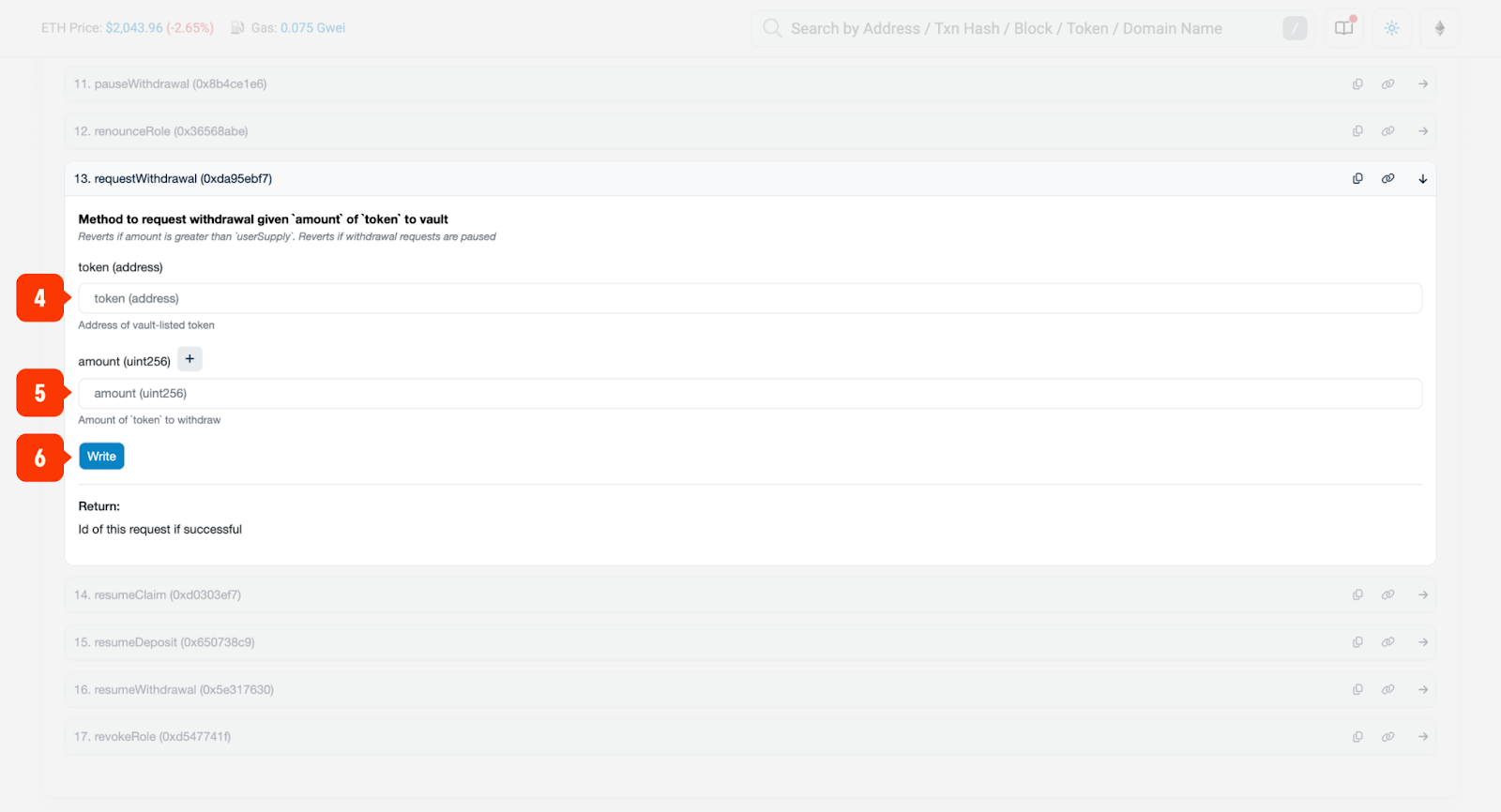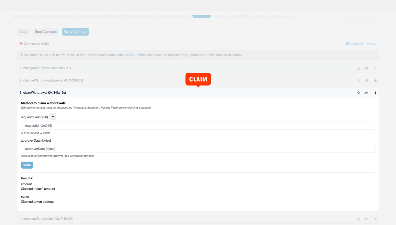 4. After 24 hours, you can proceed with the claim. To do this, return to the Vault contract and call the claimWithdrawalmethod, passing requestId and approvedData (can be empty = 0x) as parameters. Click Write and sign the transaction.