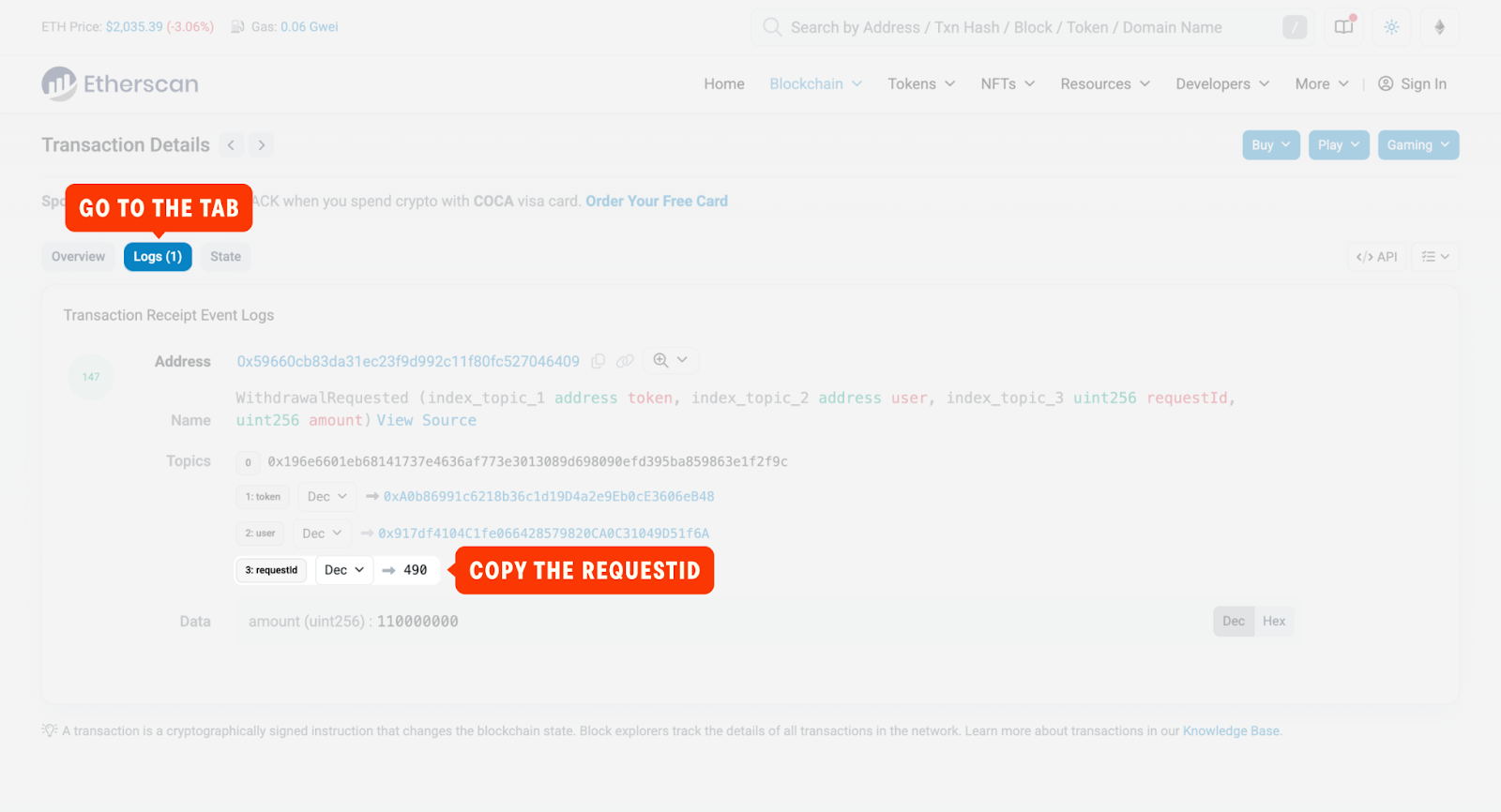 3. Open the submitted transaction and copy the requestId — you will need it for the next step.